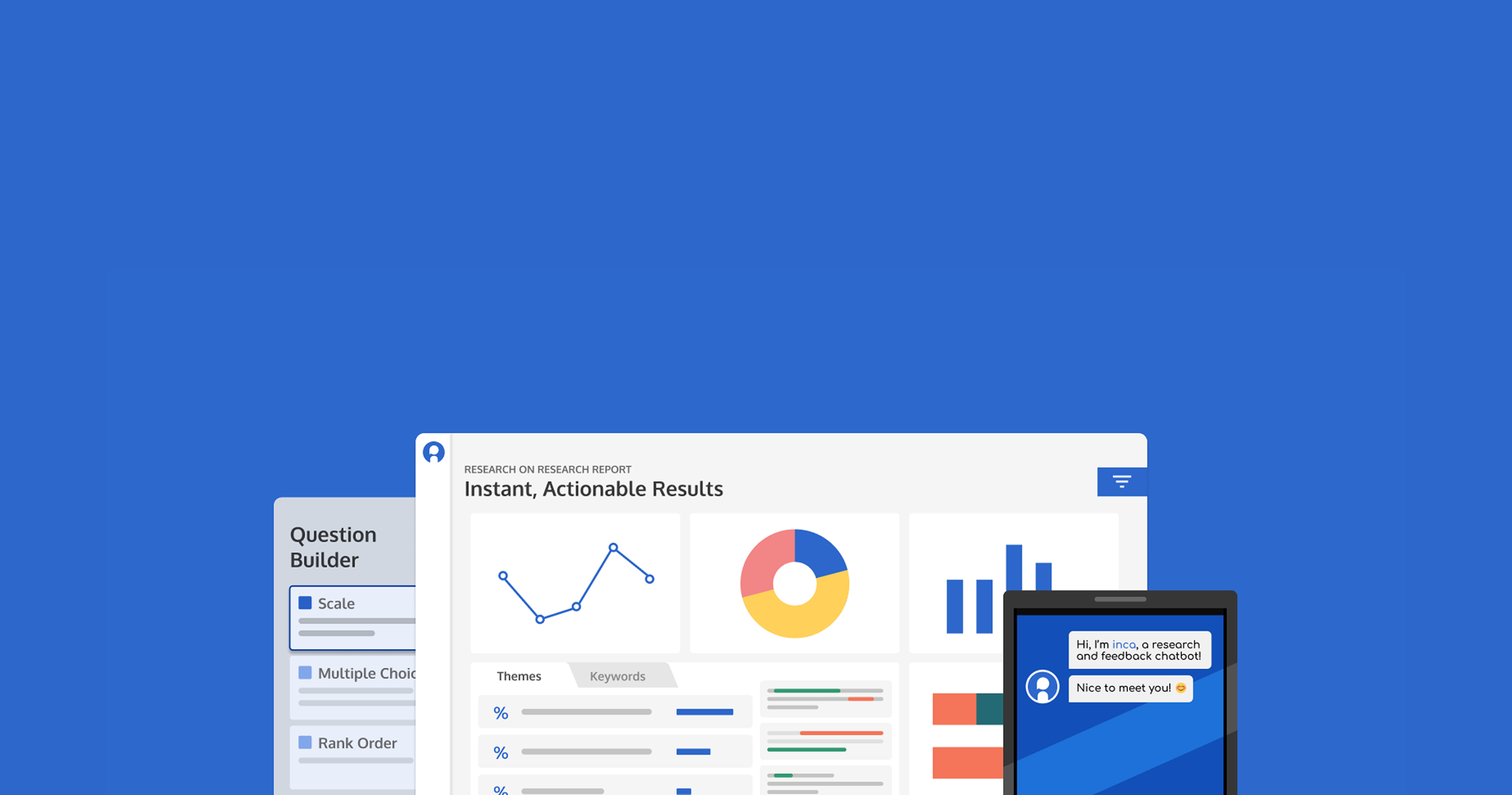Traditional survey platforms are built mostly for structured close-ended questions, offering a participant experience that is single-dimensional question answering. inca combines this quantitative rigor with qualitative excellence: it measures all the quant survey metrics you need and uses qualitative principles to engage participants, explore motivations with sophisticated AI probing, and enable the discovery of subconscious drivers through projective techniques.