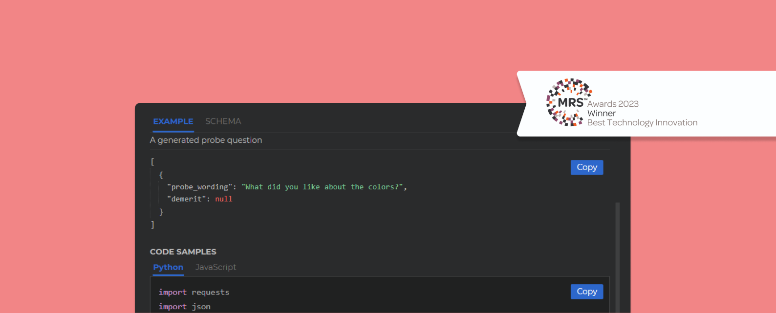 ChatGPT is an extremely powerful technology, but out of the box it won’t reliably ask the kinds of probing questions that a market researcher would want to ask. A user could tell ChatGPT to “act like a market researcher” and give it a few examples of good probing questions, but as with any professional market researcher, it needs more context, edge case handling, and expert guidance in order to reliably generate good questions. That’s why we’ve built the inca SmartProbe API on top of GPT technology, to give you confidence in high quality probing capability, and a robust API that’s easy to integrate.