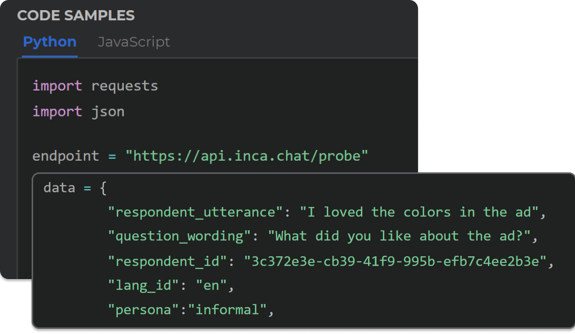 Large language models (LLMs) such as ChatGPT have revolutionized what is possible with conversational AI. inca SmartProbe API is built on top of LLM technology, but fine-tuned by a team of market researchers and natural language processing experts to ensure that you can get reliable, relevant follow-up questions to your open-ended survey responses.