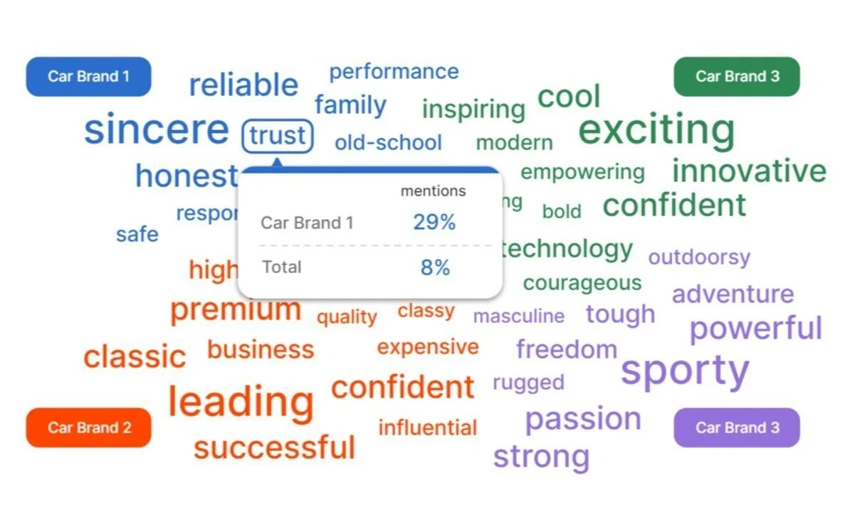 What immediately pops up in consumers’ minds when they hear a brand name? How about vice-versa, so your brand stands out? Brand Association maps open-ended associations with brand names to identify what differentiates your brand from the competition.
