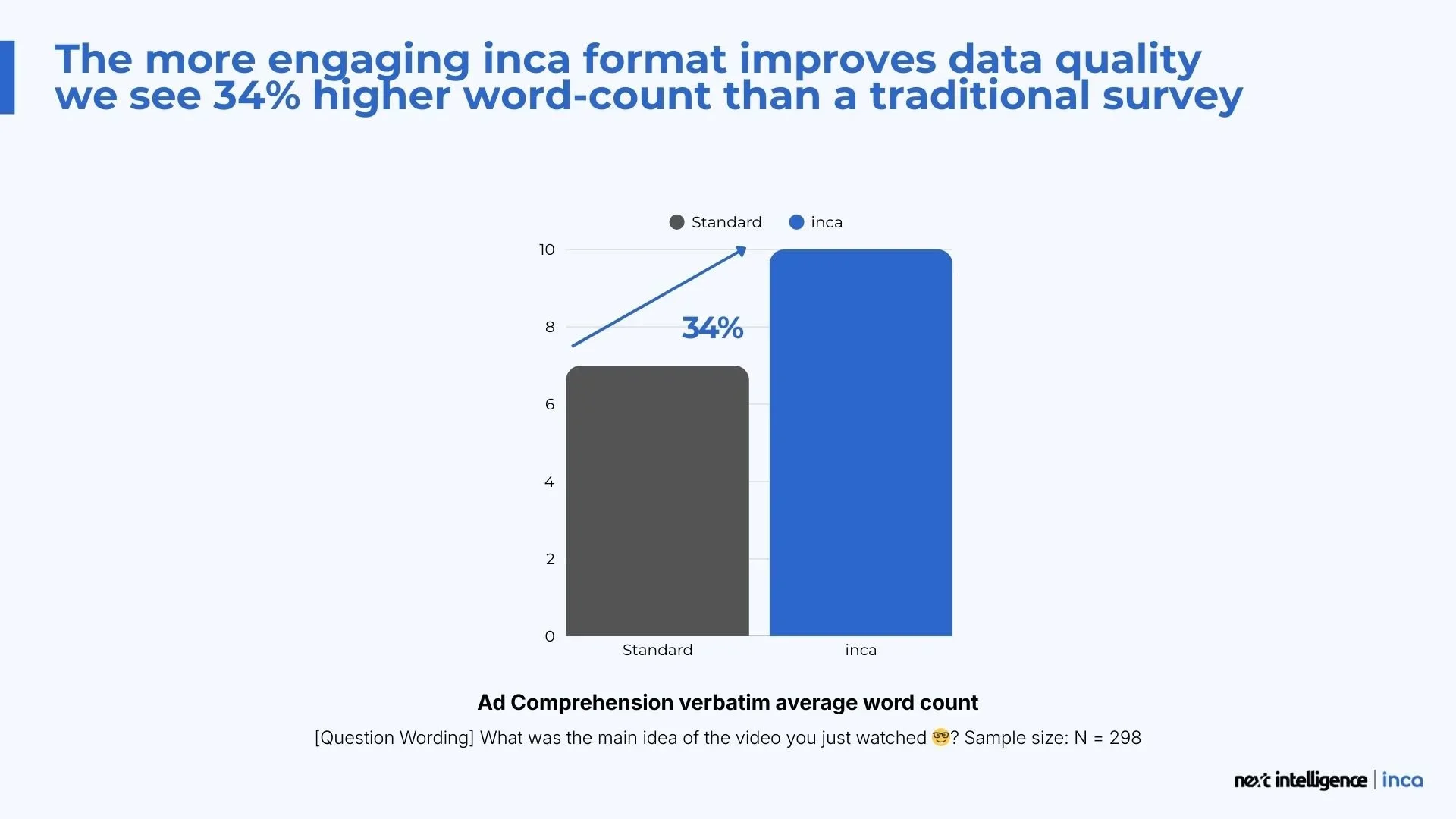 For instance, in a study about ad comprehension, an inca survey elicited 34% higher word count compared to a traditional survey for the same open-ended question. And that’s before we added inca SmartProbe to gather deeper feedback from our intelligent AI agent. That’s a lot more context behind every answer!