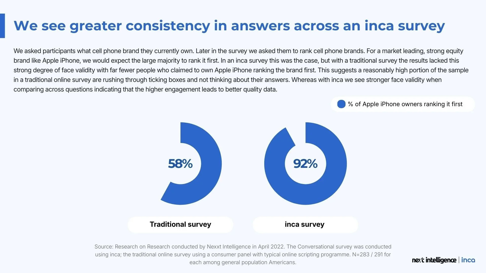 In the traditional survey, only 58% of participants who claimed to own an iPhone ranked it first. But in the inca survey, 92% of participants who said they own an iPhone ranked it first.