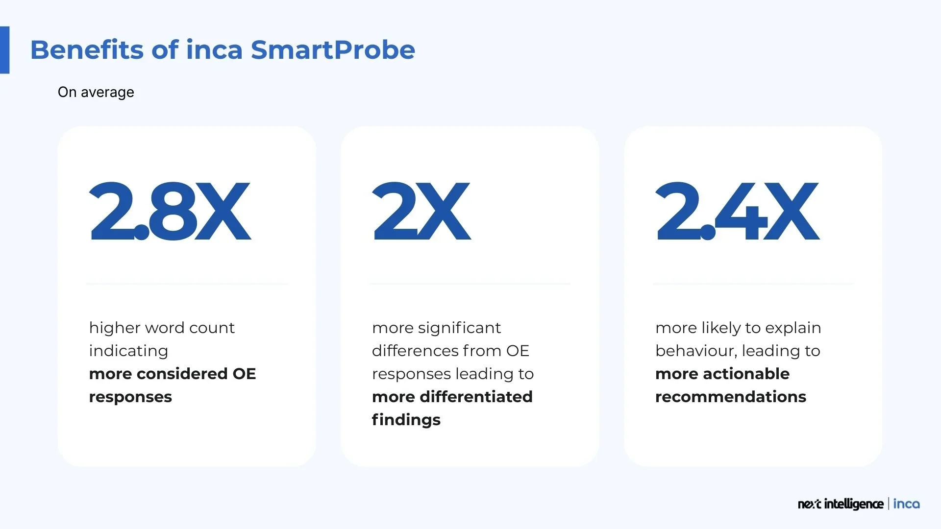 When inca SmartProbe is added to an open-ended question, the additional depth of insight obtained is 2.4× more likely to explain participant behavior, giving researchers clearer, more actionable recommendations.