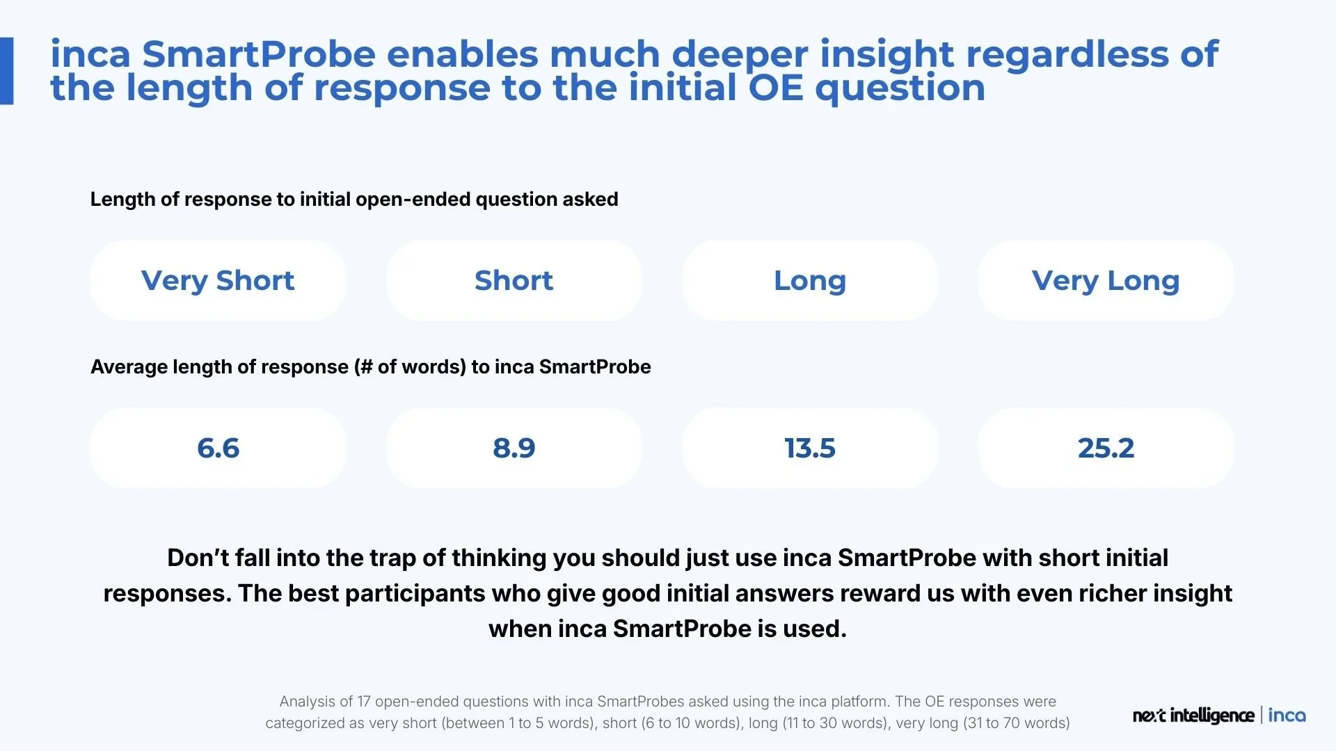 Length alone doesn’t equal insight. That’s why inca SmartProbe is evaluated not only on volume, but on the quality of the responses it elicits.