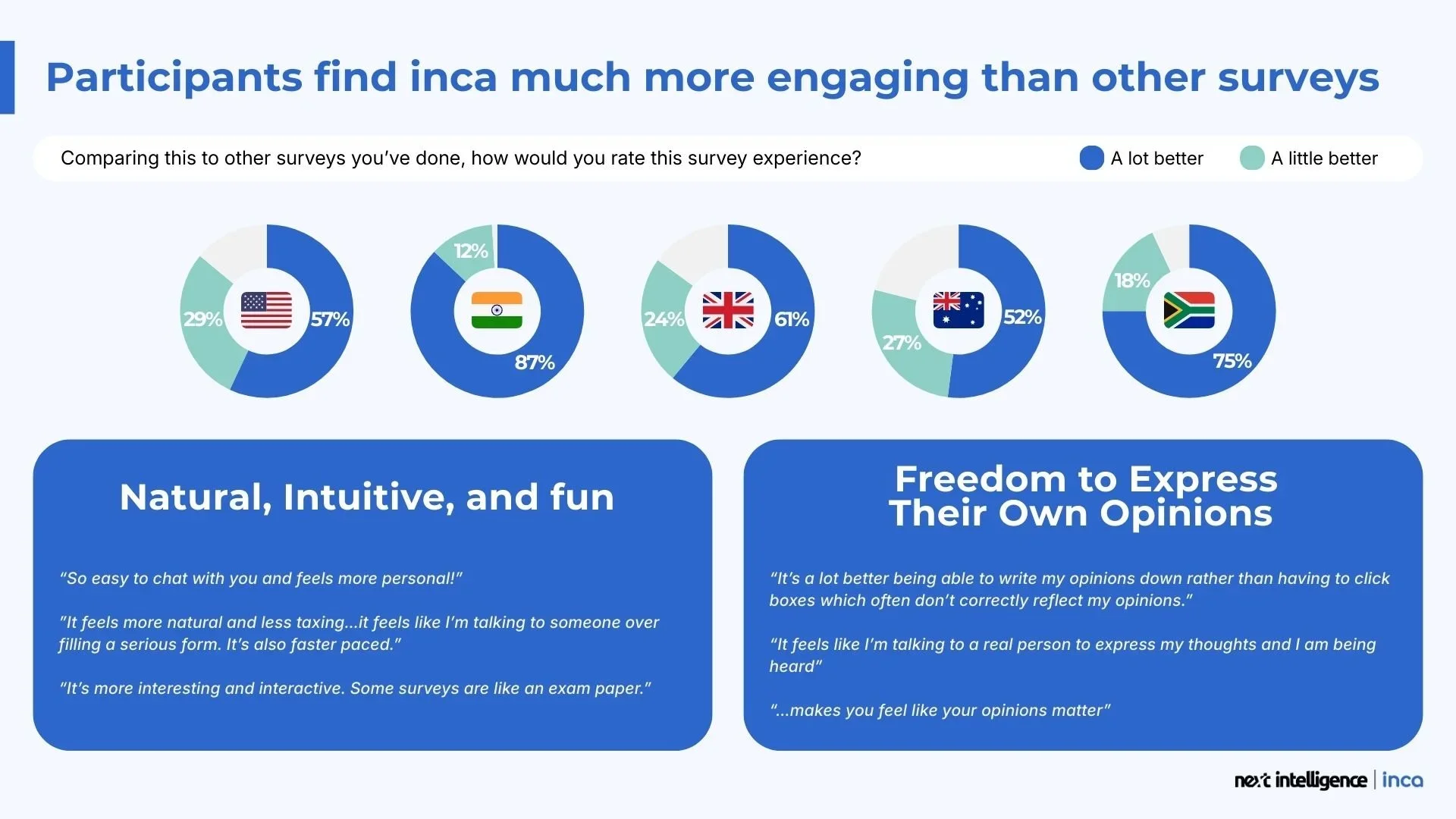 In fact, 66% stated that inca’s conversational survey agent “allowed me to express myself better than other surveys,” highlighting how comfortable participants feel sharing more detail in a conversational environment.